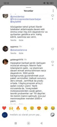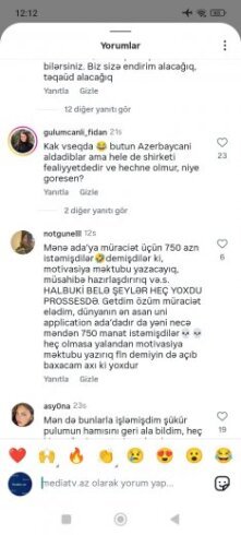 Bir neçə gün Mediatv.az xəbər portalında Tribunainfo.az-a istinadən Xaricdə təhsil vədi verən “Pilgrim Education” ailələri aldatmağa davam edir" sərlövhəli məqalə dərc etmişdik və bu məqaləni Mediatv.az xəbər portalının instagram səhifəsində paylaşmışdıq.Qısa bir vaxtda Mediatv.az xəbər portalının instagram səhifəsin 71 mindən artıq baxış gəlmiş,şərh bölümündə isə 160-dan artıq fikir bildirilmişdir.Əksər izləyicilərimiz “Pilgrim Education” şirkətinin rəhbəri Aisa Aslanova tərəfindən aldanıldıqlarını və pullarının geri qaytarılmamısdan şikayətlənirlər.Onlar Aisa Aslanovanın kimlərsə tərəfindən himayə olunduğunu, ölkə prezidenti İlham Əliyevdən və Birinci vitse-prezident Mehriban Əliyevadan bu qanunazidd fəaliyyətin qarşısının alınması üçün zəruri tədbirlərin görülməsini ,onlara dəymiş maddi ziyanın geri qaytarılması üçün aidiyyatı qurumlara göstəriş verilməsini xahiş edirlər.
