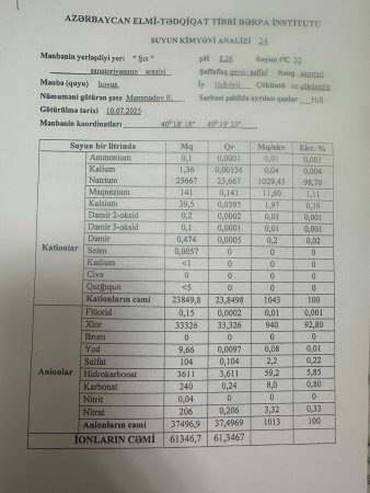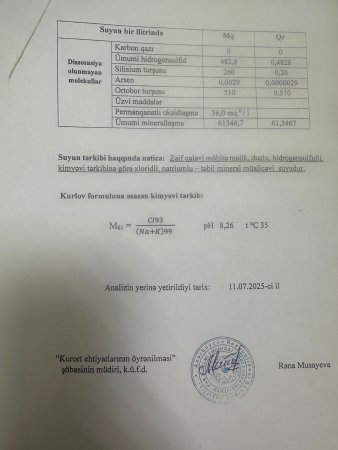 Bu gün Səhiyyə Nazirliyinin imzaladığı rəsmi rəy gözümüzün önündədir - və rəqəmlər ürəkaçan deyil, qorxuncdur: 1) Ümumi mineralizasiya - 61 346 mq/l; 2) Xloridlər - 33 326 mq/l; 3) Hidrogen-sulfid - 482,8 mq/l; 4) Arsen - aşkar olunub.