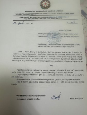 Hələ biz o suyun mənbəyindəki sanitar və mikrobioloji vəziyyətdən danışmırıq. Elə təqdim etdiyimiz fotolardan da açıq görünür ki, ətraf mühit tamamilə antisanitariya içindədir. Qəribəsi budur ki, suyun mikrobioloji tərkibi ilə bağlı ümumiyyətlə heç bir araşdırma aparılmayıb. Səhiyyə nazirliyinin verdiyi rəyin özündən də görünür - yalnız guya mineral tərkib yoxlanılıb. Bu isə sual doğurur: nazirliyin əməkdaşları doğrudan da həmin mənbəyə gediblərmi? Çox güman ki, yox. Böyük ehtimalla, nümunələr ekspertiza üçün onlara sanatoriya rəhbərliyi tərəfindən təqdim edilib, özü də başqa su ilə qarışdırılıb. Yəni, xalqı aldatmaq üçün elə bil ki, “təmiz içməli su” analizi aparılıb. Bu, artıq sadəcə səhlənkarlıq deyil, açıq-aşkar saxtakarlıqdır.