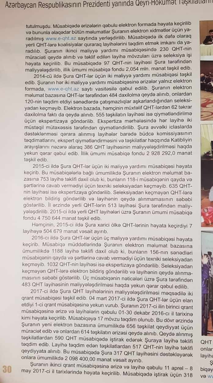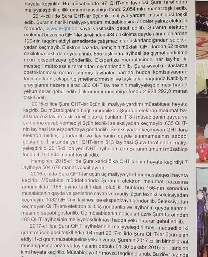Bu məsələni həmkarlarımız da qaldırmışdı ki, Agentlik yalan deyir və ictimaiyyəti aldadır. İndi mən də həmin faktları da sizlərə məhz QHT Şurasının özünün 10 illik hesabat jurnalından təqdim edirəm. Təkcə 2010-cu ildə QHT Şuranın 1 müsabiqəsinə müraciət edən QHT-lərin sayı 845, 2016-cı ildə isə rekord sayda – 1188 QHT olub.