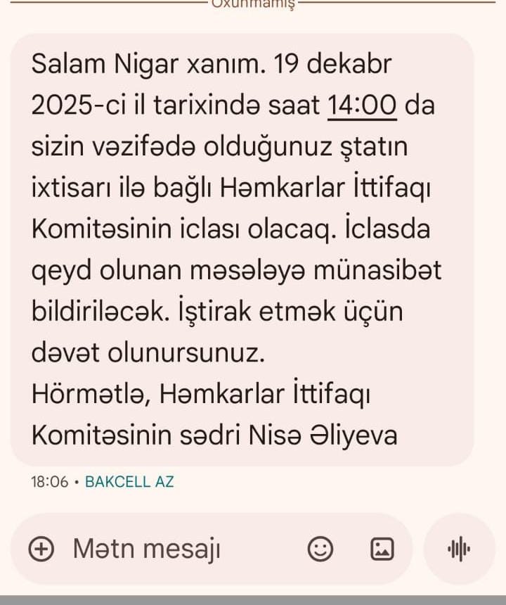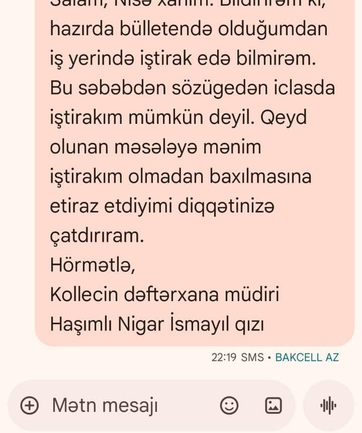 Hazırda direktor, bütün bu təzyiqlərə baxmayaraq işdən çıxmadığımı görərək, çalışdığım ştat vahidinin ləğv edilməsi təşəbbüsü ilə çıxış edir. Kollecin Həmkarlar İttifaqının sədri Nisə Əliyeva, mən xəstəlik vərəqəsində (bülleten) olduğum müddətdə mənə mesaj yazaraq, ştatın ləğv ediləcəyi ilə bağlı iclas keçiriləcəyini bildirmişdir. Təəssüf doğuran haldır ki, həmkarlar ittifaqı işçinin deyil, rəhbərliyin maraqlarını müdafiə edən mövqe sərgiləyir.