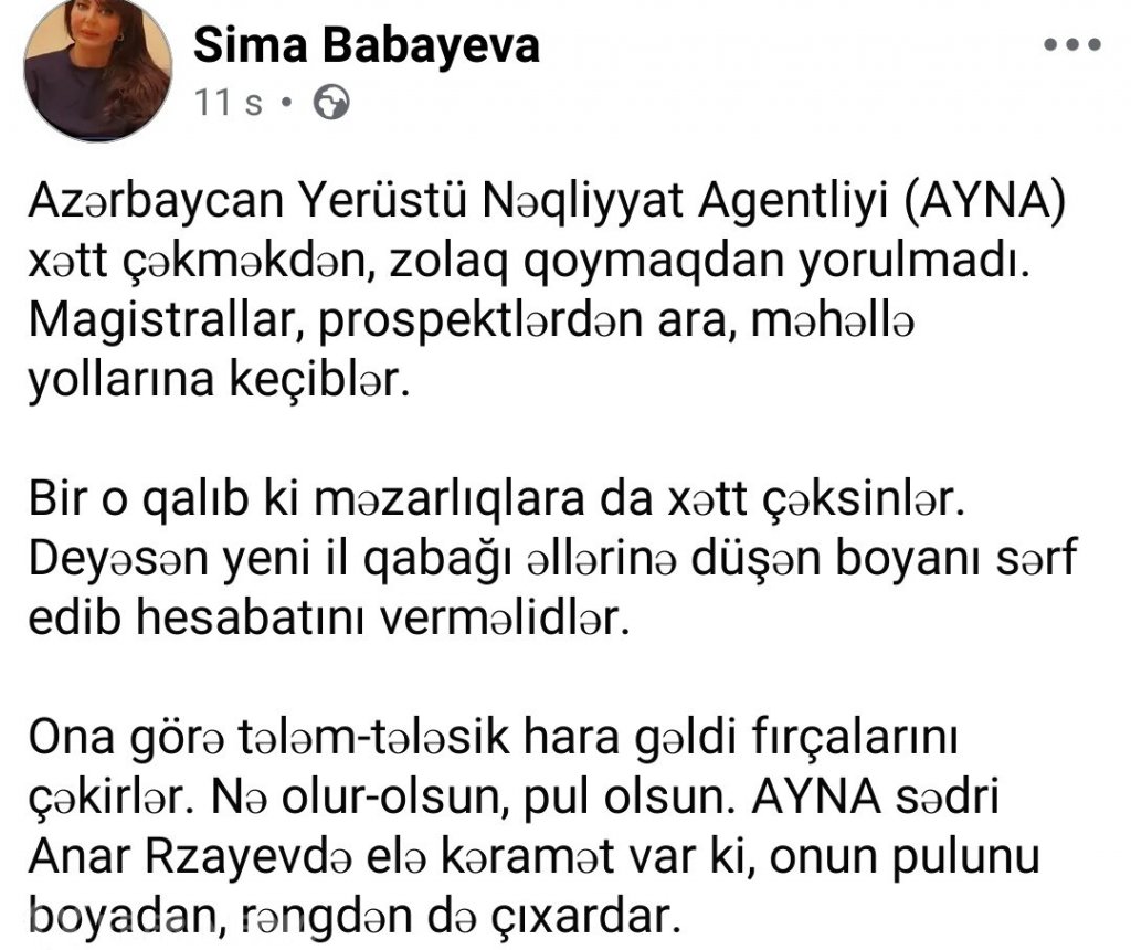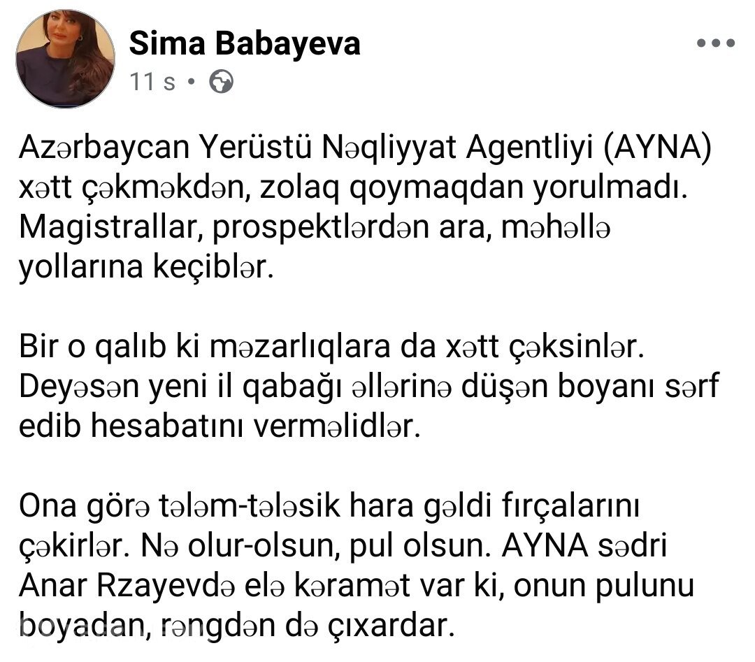 Bu barədə Sima Babayeva Facebook səhifəsində paylaşım edib.