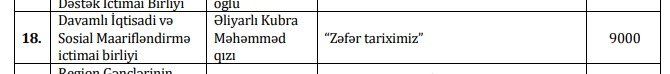 Qısa zamanda Aygün Əliyeva bu rəfiqəsinin də rəhbərlik etdiyi təşkilatı qrantsız qoymur. Bu istiqamətdə Yenixeber.org-a ötürülən məlumata görə, Kubra Əliyarlının sədri olduğu “Davamlı İqtisadi və Sosial Maarifləndirmə” ictimai birliyi 2022-ci ilin qrant müsabiqəsində 9 min manat qrant vəsaiti alır. İllərlə QHT sektorunda ciddi təşəbbüsləri ilə seçilən təşkilatlar 8-9 min manat qrant aldığı halda, heç bir ciddi fəaliyyəti olmayan yeni bir QHT də 9 min manat qazanır(?)