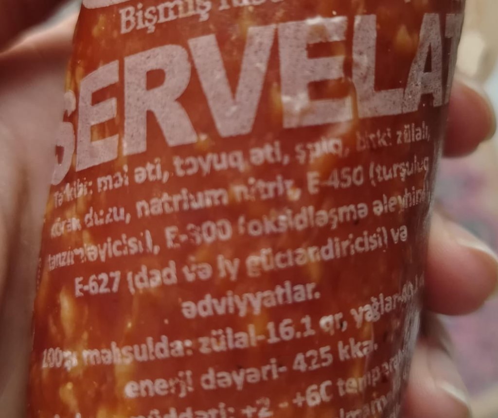 Son illər bazarda “keyfiyyətli”, “ət məhsulu” adı altında satılan kolbasaların tərkibi ciddi suallar doğurur. “Best Beef” müəssisəsinə məxsus servelat kolbasasının üzərində göstərilən məlumatlar da bu məhsulun tam təbii olmadığını açıq şəkildə ortaya qoyur.