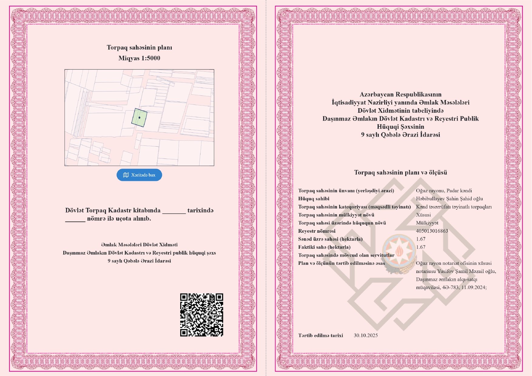Şahin Qocayev bildirib ki, torpaq sahəsi Oğuz rayonunun Padar kəndində yerləşir.