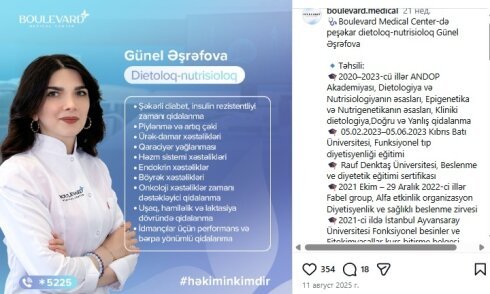 Məlumatda klinikada özünü dietoloq-nutrisioloq kimi təqdim edən Günel Əşrəfova barədə də iddialar yer alır. Qeyd olunur ki, Günel Əşrəfovanın heç bir ali tibbi təhsili yoxdur.