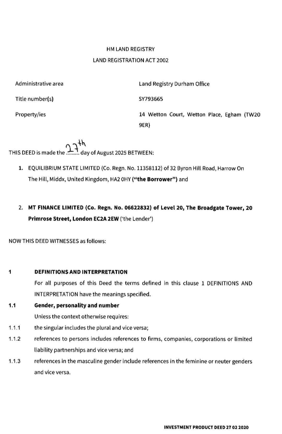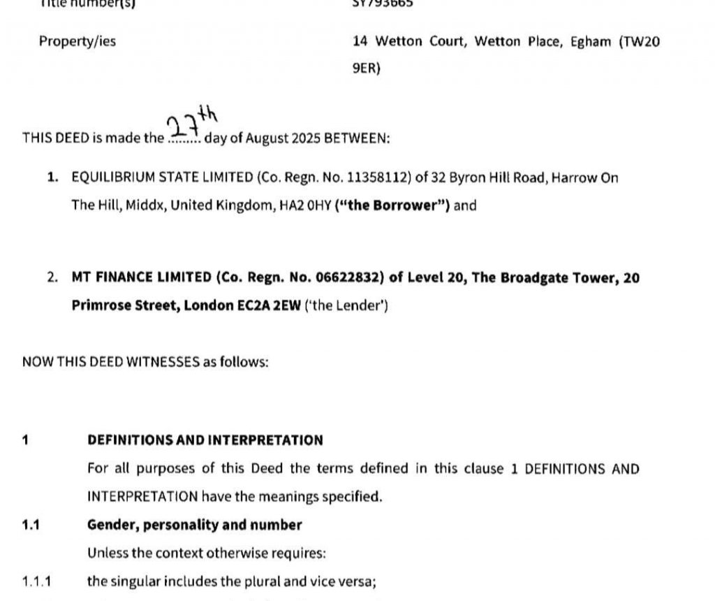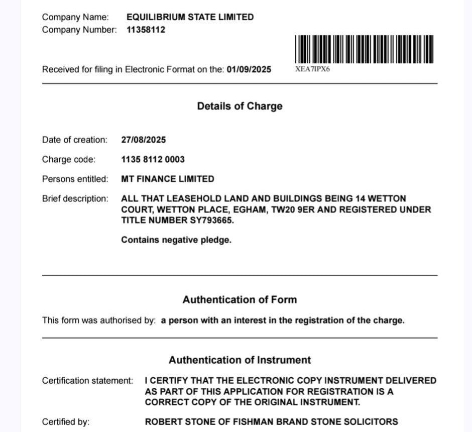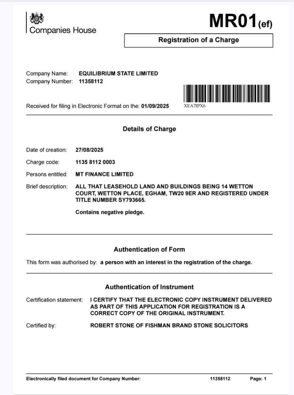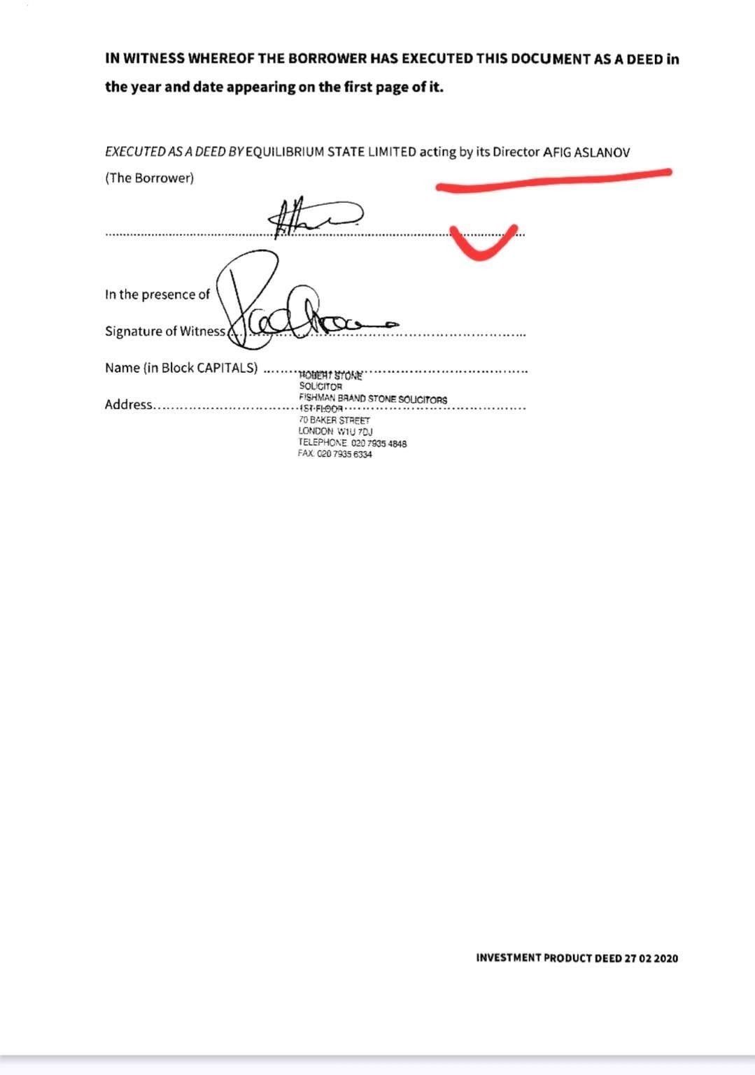 “Afiq Aslanov avqustun 27-də İngiltərənin MT FINANCE LIMITED şirkətindən yüksək faizlə (10.2 % Avropa üçün yuxarı göstəricidir) 1 il ərzində geri ödəmək şərtilə 235 min 950 funt (530 min manata yaxın) pul götürüb. Bu kredit Egham şəhərindəki 1a Wetton Court (Title No. SY793665) ünvanındakı daşınmaz əmlak üzərində girov (charge) yaradılması ilə təmin edilib.