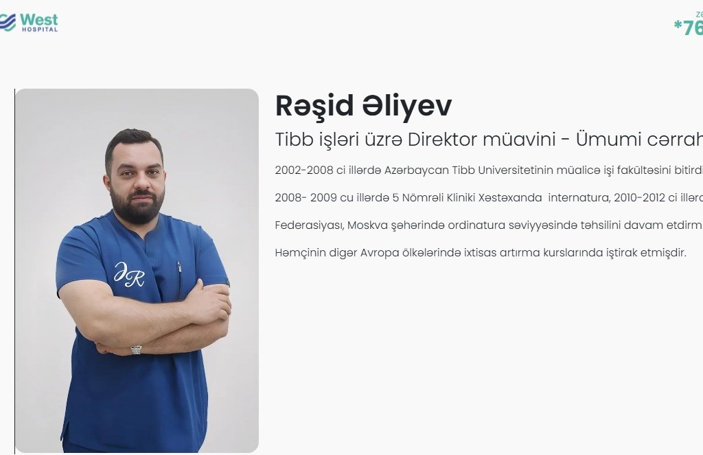 Səhiyyə Nazirliyinin nümayəndələri isə bildiriblər ki, 2023-cü ildən “Vest Hospital” MMC-də tibb işləri üzrə direktor müavini işləyən ümumi cərrah Rəşid Əliyev və digərləri sertifikasiya şəhadətnaməsi olmadan praktik tibb fəaliyyəti ilə məşğul olublar. Qeyd edilib ki, həkim ümumi cərrah kimi fəaliyyət göstərməsinə baxmayaraq, əvvəldən etibar qazandığı pasiyentlərinə plastik cərrah kimi də xidmət göstərib.