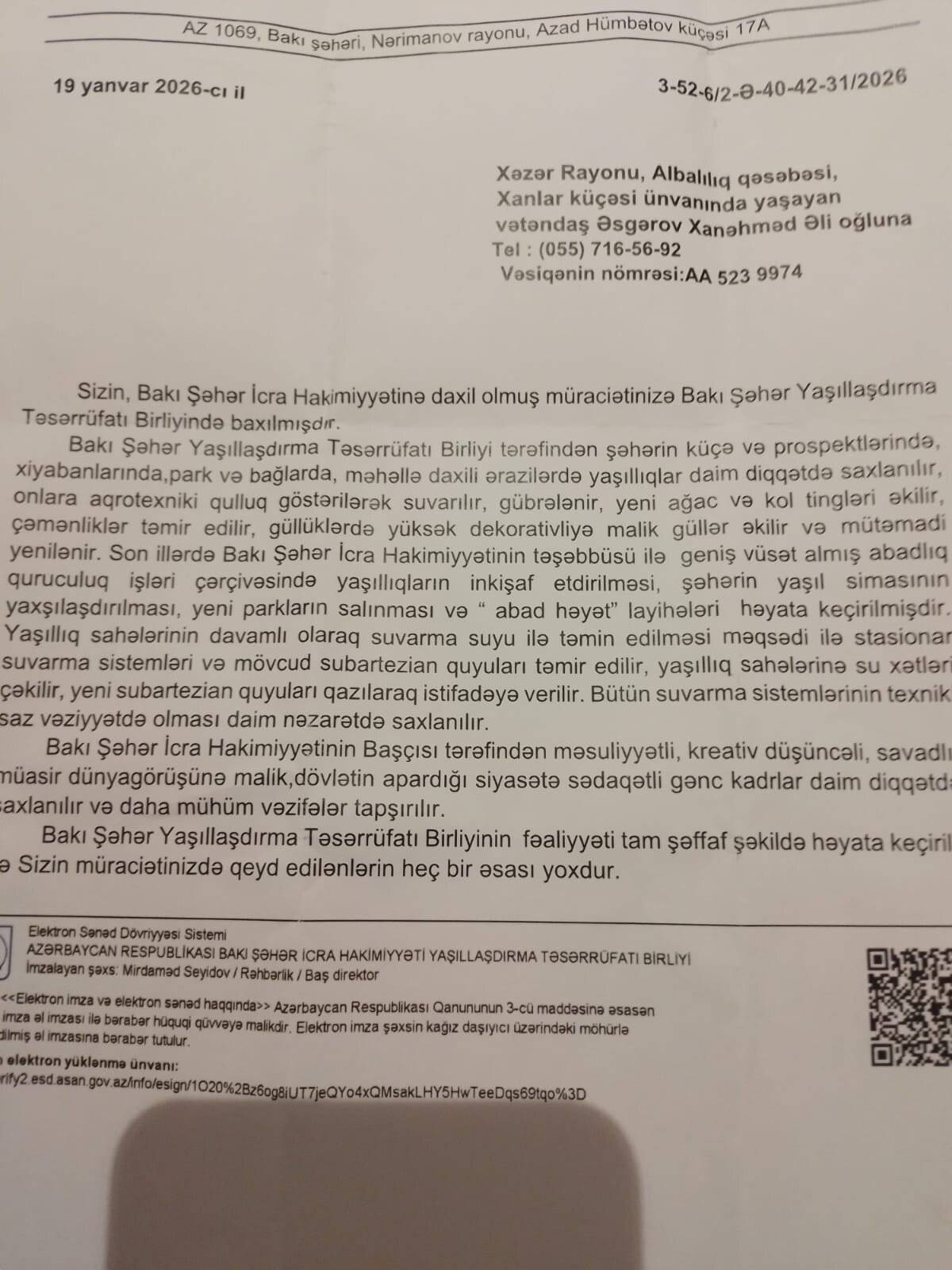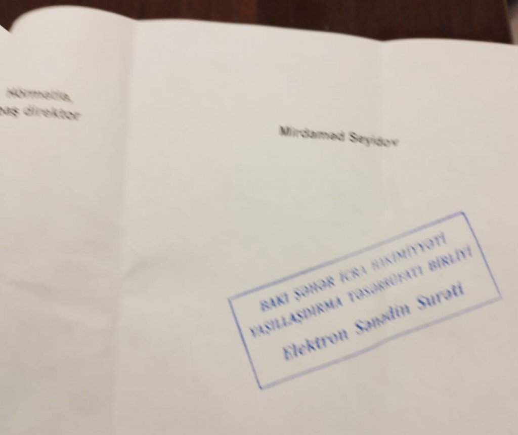 Nizami rayonunun komissarı işləyib. Yaşarla əlbir olaraq bütün oğurluqları bərabər edirlər. Yaşıllaşdırma Təsərrüfatının nəzdində ağac-bəzək bitkiləri savxozu var. Həmin savxozun işi ondan ibarətdir ki, Bakı şəhərinə lazım olan gülü, çiçəyi əkib, becərib vermək. Ancaq bunlar tender edərək gülü, çiçəyi pulsuz götürürlər ayrı yerdən guya aldılar kimi qələmə verirlər. Dövlətin büdcəsini bu yolla talayırlar. Qurumdan mənə məktub gəlib və Mirdaməd Seyidov mənə yazıb: "Sənin dediyin faktların heç biri doğru deyil”. Mən baş prokurorluğa belə müraciət edirəm. Demişəm ki, 3 milyondan çox pul oğurlanıb. Prokuror müəyyən səbəblərdən oranı yoxlaya bilmədiyini dedi. Hətta Ekologiya Nazirliyinə də məsələ ilə bağlı müraciət etdim. Nazirin birinci müavini ilə görüşdüm. Mənə bildirdilər ki, "ora biz yox, Eldar Əzizov baxır”. Eyni zamanda mən Mehriban xanıma da müraciət etdim. Bir müddətdən sonra mənə Yaşıllaşdırmadan mənə məktub gəlir ki, "Sizin Bakı şəhəri İcra Hakimiyyətinə olan müraciətinizə Yaşıllaşdırma İdarəsində baxılıbdır”. Yəni, oğurluq edən təsərrüfat mənim şikayətimə baxır. Prezident deyir ki, şikayət olunan ünvana şikayətçinin məktubunu göndərməyin, araşdırın. Əgər mənim qurum haqqında dediklərim yalandırsa, iş qaldırın. Yalan olsaydı, mənim torbamı indiyə qədər tikmişdilər. Həmin ağac-bəzək savxozunda bir sexi mən yaratmışdım. İlə 3 milyon bitki yetişdirirdim. İndi heç 300 min də yetişdirə bilmirlər. Mən bu qanunsuzluqları dövlətimizə, dövlətçiliyimizə, Prezidentə dəstək olmağa görə işıqlandırıram. Çünki dövlətin büdcəsini talayırlar. Xırdalıqları ölkə başçısına çatdırmırlar. Prezident Administrasiyasında Süleyman İsmayılov var, məktublar şöbəsinin müdiridir. S. İsmayılov orada alver edir və məktubları itirir.