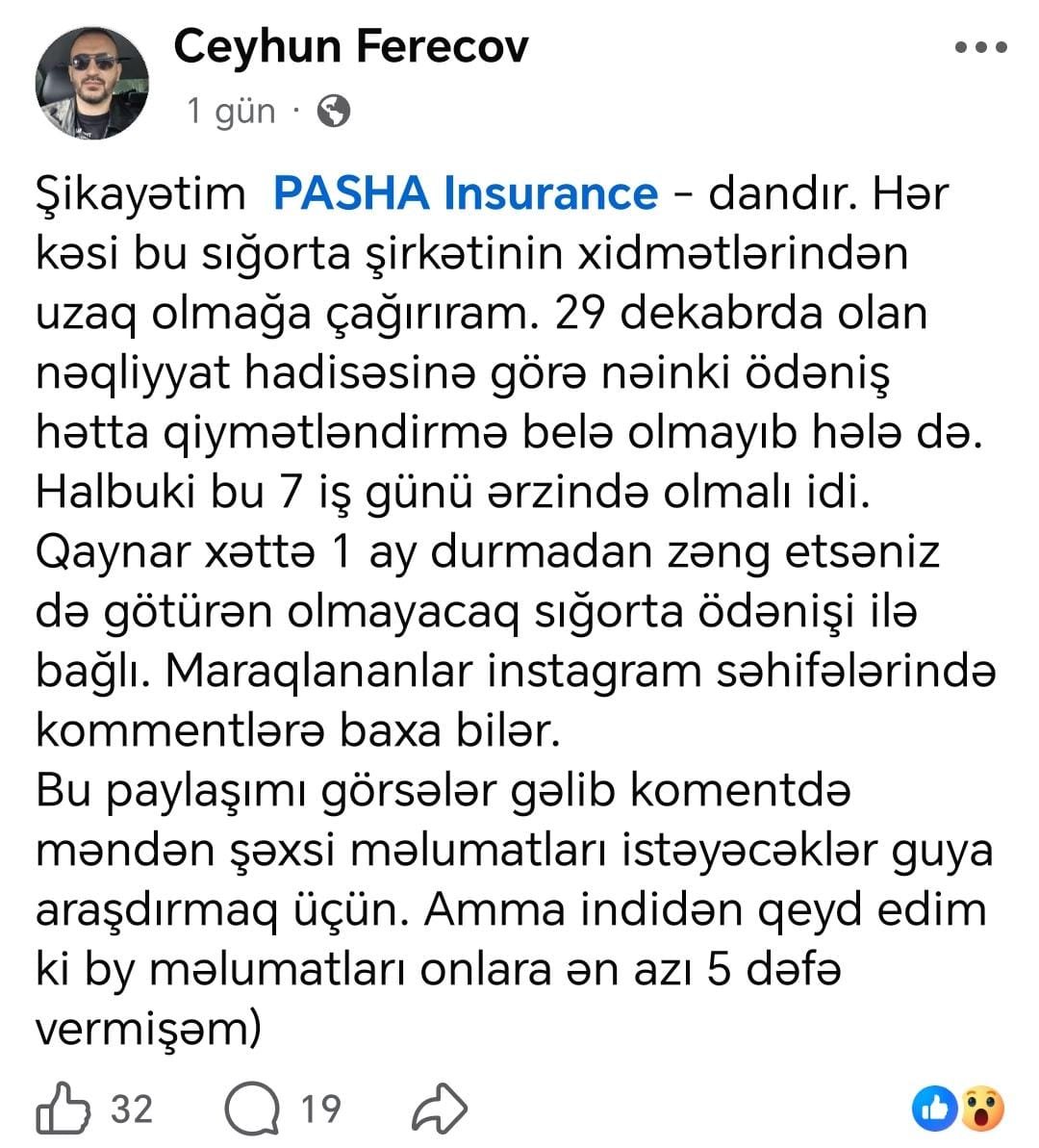 Bu barədə sözügedın sığorta şirkətinin müştərisi Ceyhun Fərəcov yazıb. O bildirib ki, ötən ilin dekanrından baş verın hadisəyə görə” PASHA Insurance” şirkətindən ödəniş ala bilmir:”29 dekabrda olan nəqliyyat hadisəsinə görə nəinki ödəniş, hətta qiymətləndirmə belə olmayıb hələ də.