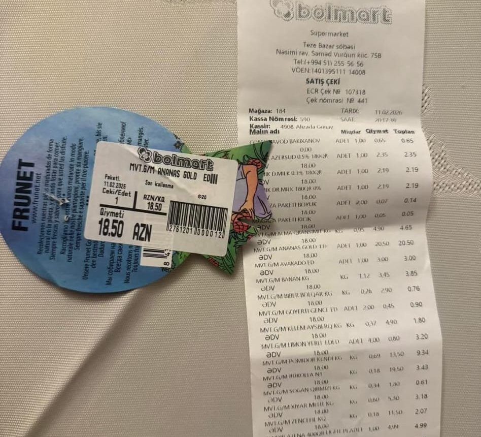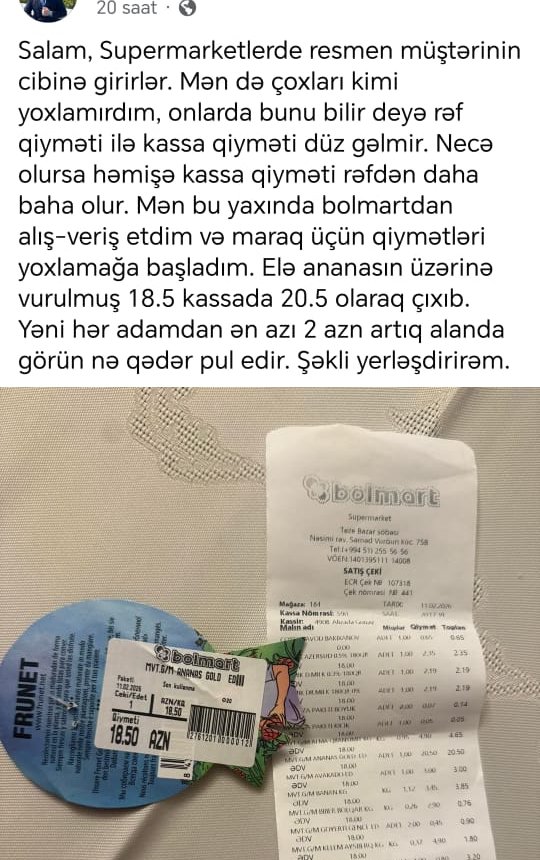 Bunu sözügedən marketdən mütəmadi alış-veriş edən müştəri Suad Süleymanlı bildirib. O bildirib ki, dəfələrlə bu barədə eşitsə də, heç vaxt qəbzdəki qiymətlərə diqqət etməyib. Ancaq bu dəfə diqqət edən zaman qiymət fırıldağını görüb: “Supermarketlərdə rəsmən müştərinin cibinə girirlər. Mən də çoxları kimi yoxlamırdım. Necə olursa həmişə kassa qiyməti rəfdən daha baha olur. Mən bu yaxınlarda “Bolmart”dan alış-veriş etdim və maraq üçün qiymətləri yoxlamağa başladım. Elə ananasın üzərinə vurulmuş 18.5 kassada 20.5 olaraq çıxıb. Yəni hər adamdan ən azı 2 manat artıq alanda görün nə qədər pul edir”.